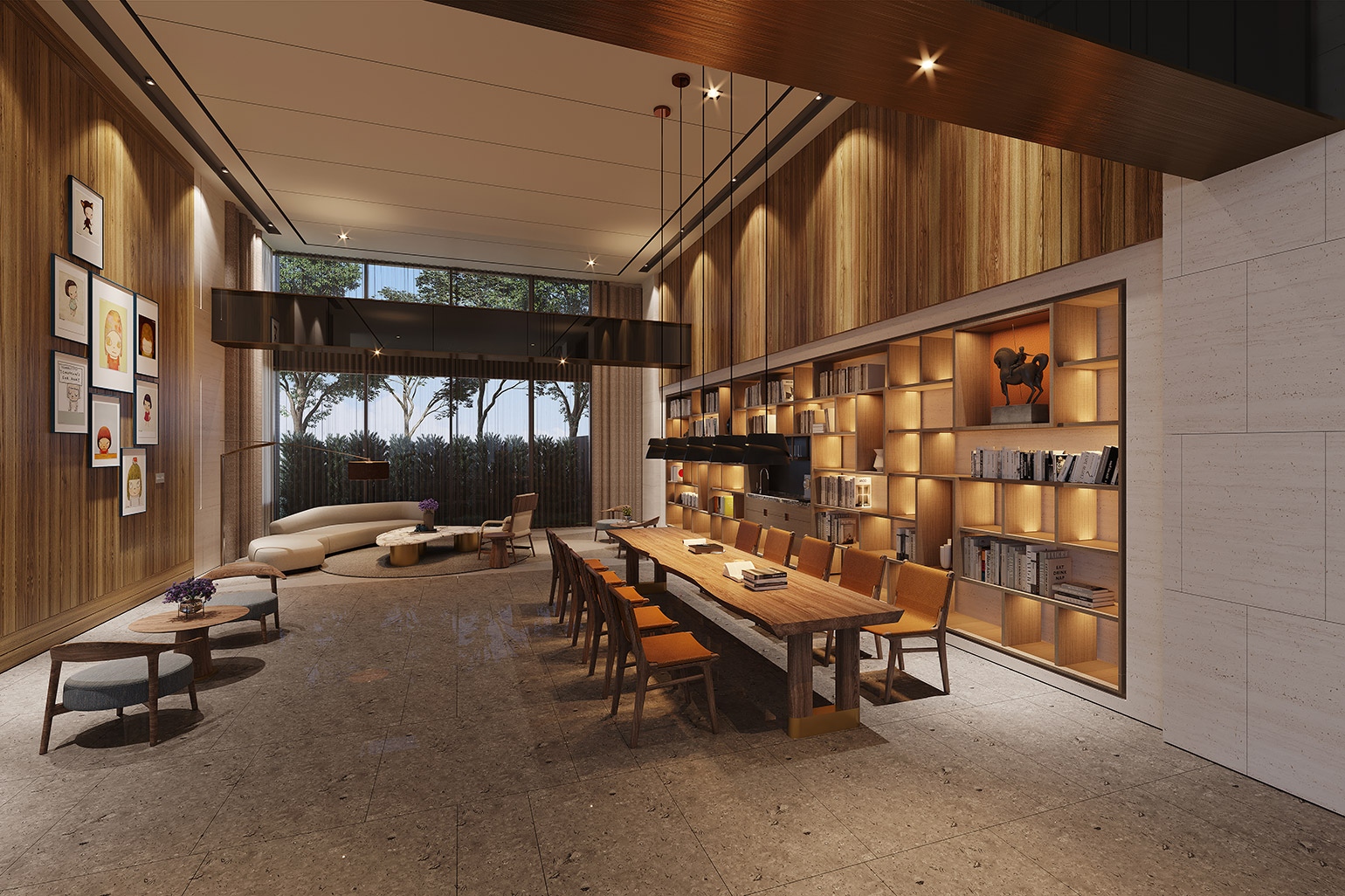 運用空間的長軸尺度,讓閱覽與交誼彼此融合又自成一區,以溫潤木紋為空間基調,原木大長桌構成閱覽室主視覺,稍稍走近,雍容木香沁入鼻息,安定了情緒,舒緩了心靈,靜靜坐讀,牆上奈良美智畫筆下的女孩也正俏皮偷看您的書。